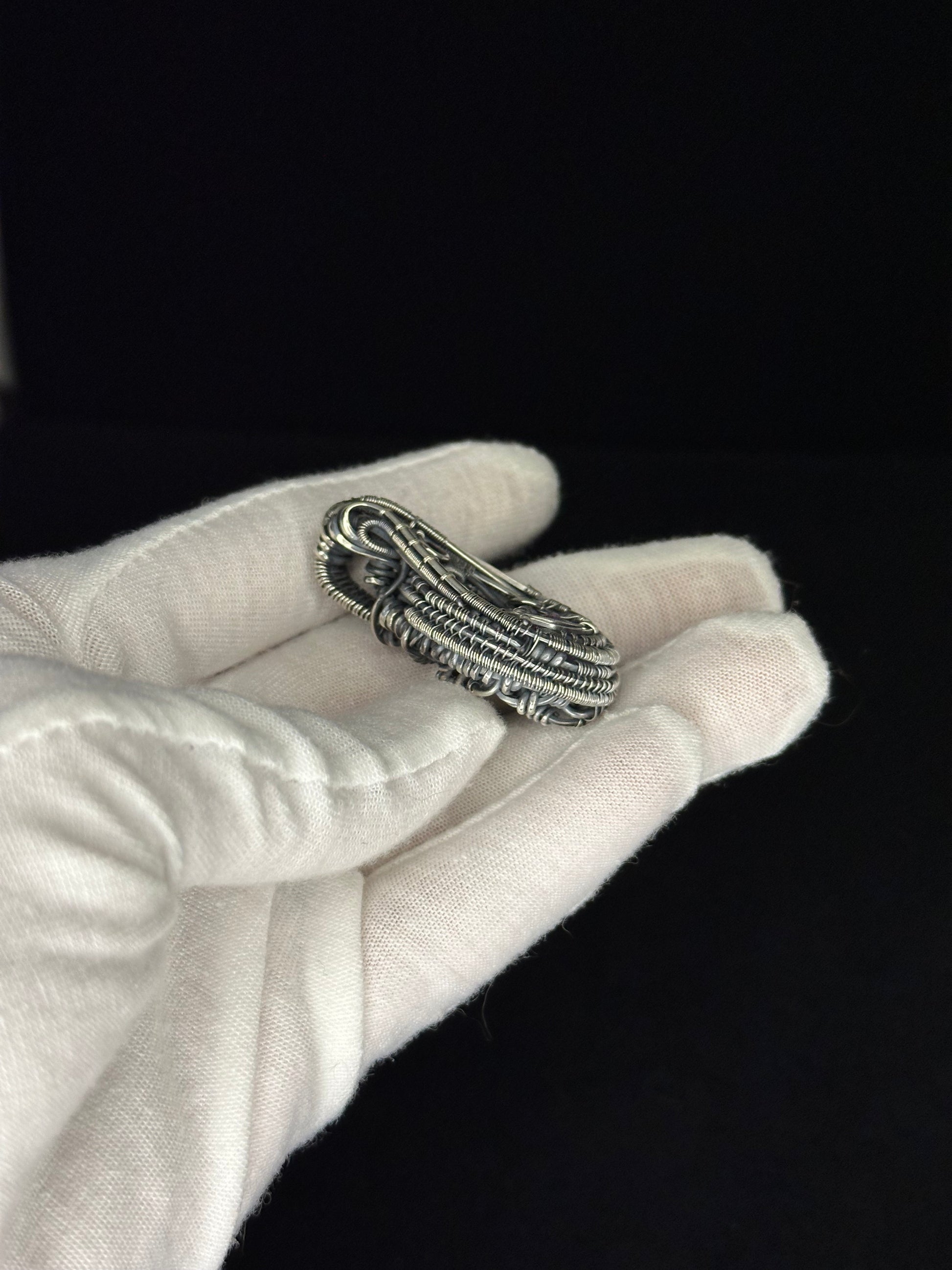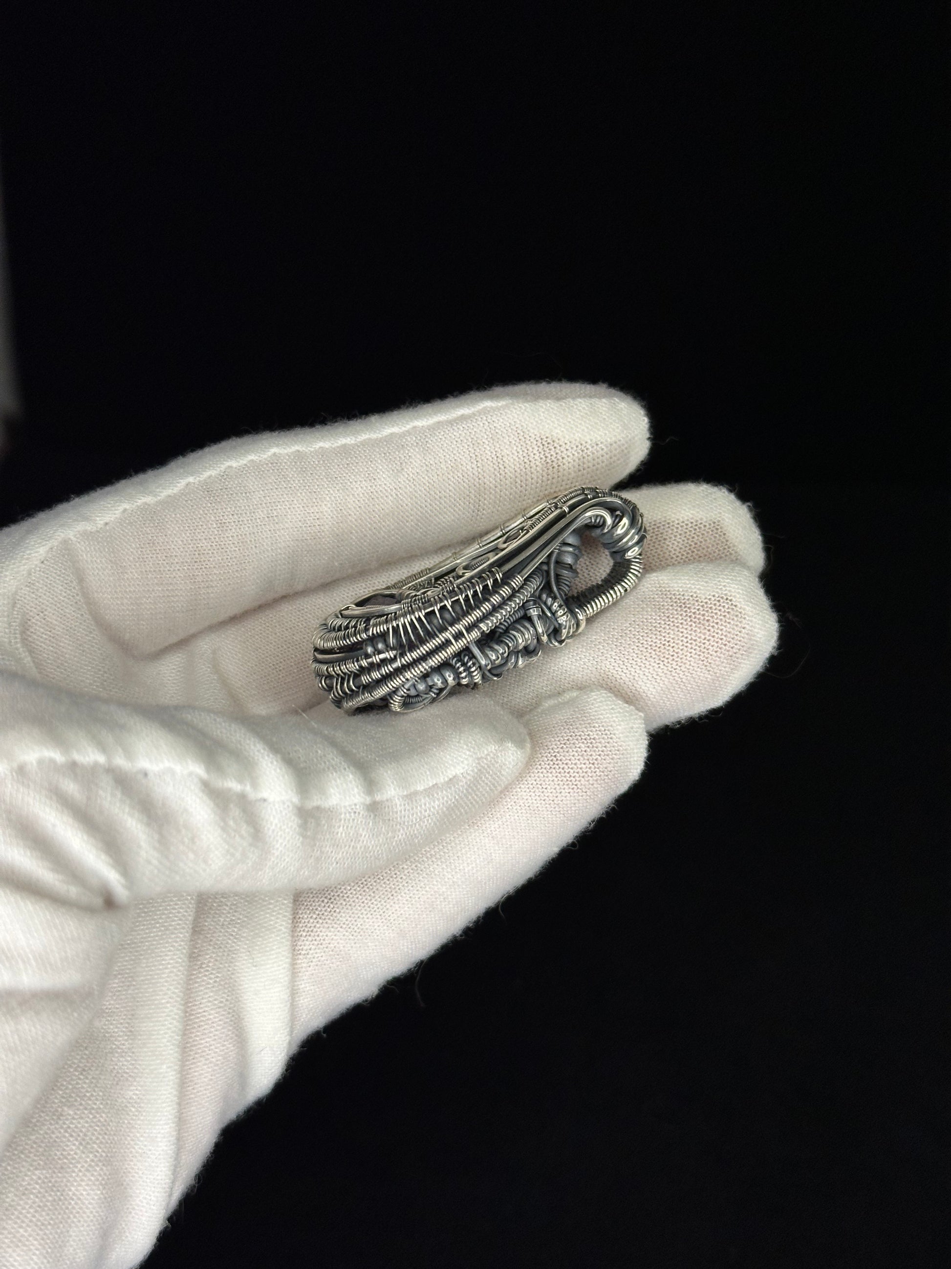 This pendant is approximately 1.76" x 1.05" and wrapped with oxidized and polished Sterling Silver wires! Comes with a 20" stainless steel ball chain & gift box!